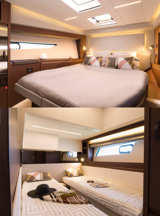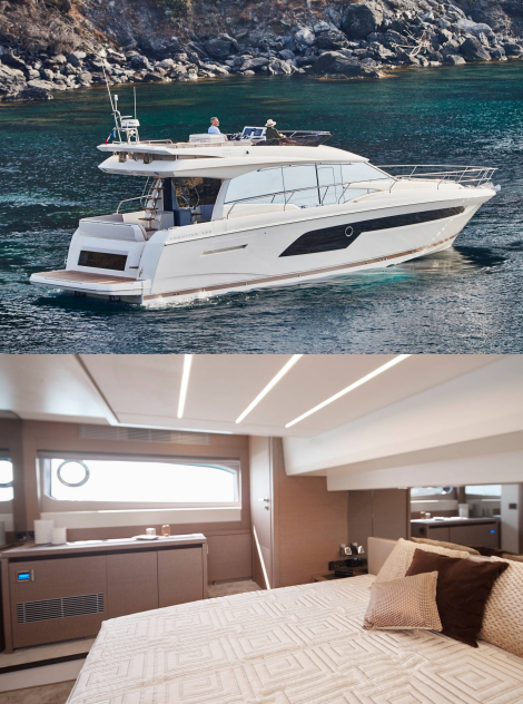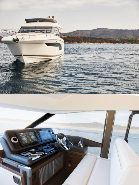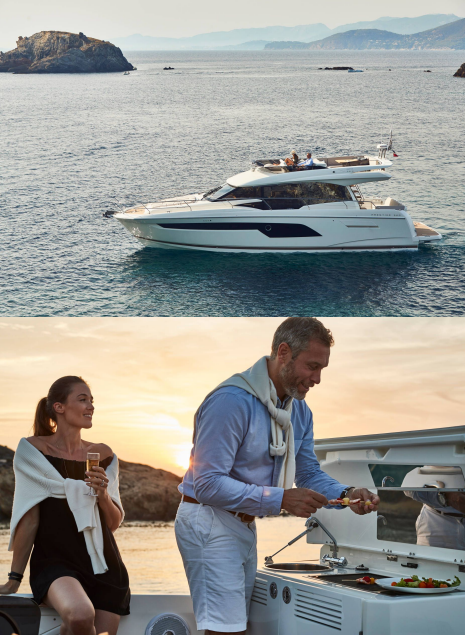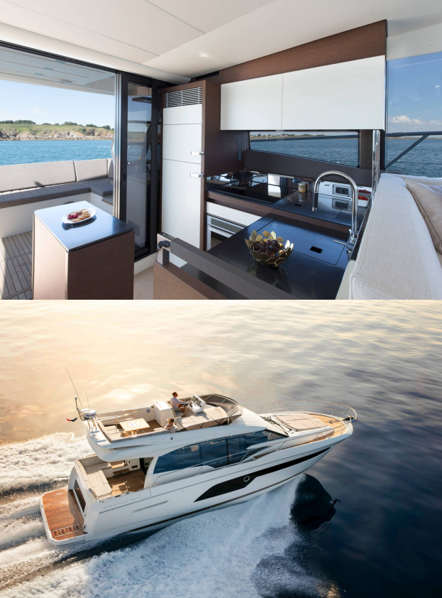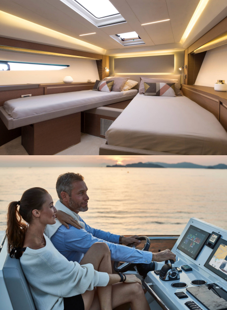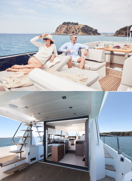 continuità dall’interno al pozzetto esterno con grandi panche a forma di L. L’ampio flybridge è dotato di cucina, salone,